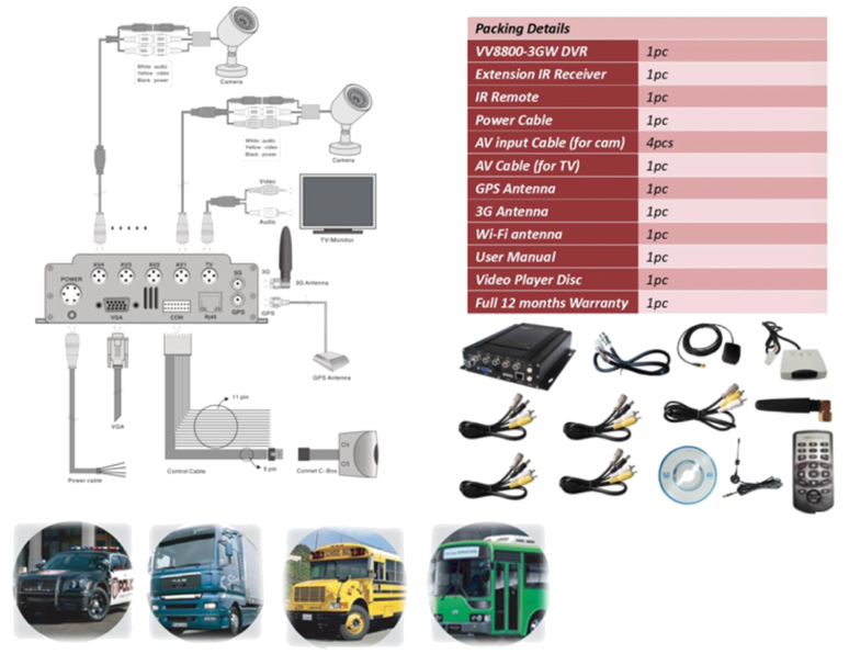 El VV8800-3GW es un robusto DVR profesional, con disco de estado sólido diseñado para la grabación en el vehículo. VV8800-3GW DVR adopta el formato de compresión H.264, puede grabar hasta 4 canales de vídeo y audio al mismo tiempo, es compatible con el disco duro de hasta 2 TB, así como la tarjeta de memoria SD de hasta 64 GB para guardar los clips de vídeo. La resolución de vídeo es de hasta D1 cada canal, y la velocidad de fotogramas es de hasta 30 fps (NTSC). VV8800-3GW funciona con todas las cámaras CCD / CMOS, es un nuevo sistema de registro en el vehículo que se puede confiar.