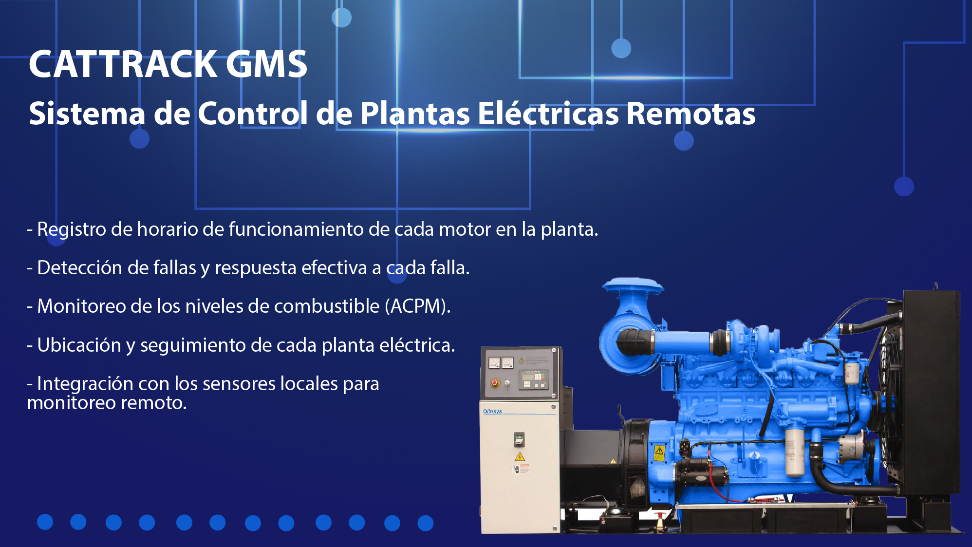Cattrack GMS brinda la tecnología necesaria de monitoreo inalámbrico soportada en la aplicación de Scadacenter, funciona como control y seguridad en distancias remotas. Esta herramienta esta almacenada en la nube, es soportada por redes satelitales y celulares, y esta vinculada a instrumental industrial especializado para medir niveles de combustible e InBeeBox 33. Características: Informes de estatus de funcionamiento, condición de fallas, niveles de combustible, temperatura del motor, presión de gasolina o aceite, exceso de velocidad del motor, recordatorios de mantenimiento, horas de trabajo, localización, alarmas por traslado no autorizado y batería baja y desconexión, cámara de vigilancia, Integración con computadora de la planta y con PLC / Variadores de velocidad / arrancadores suaves por medio de protocolo modbus.